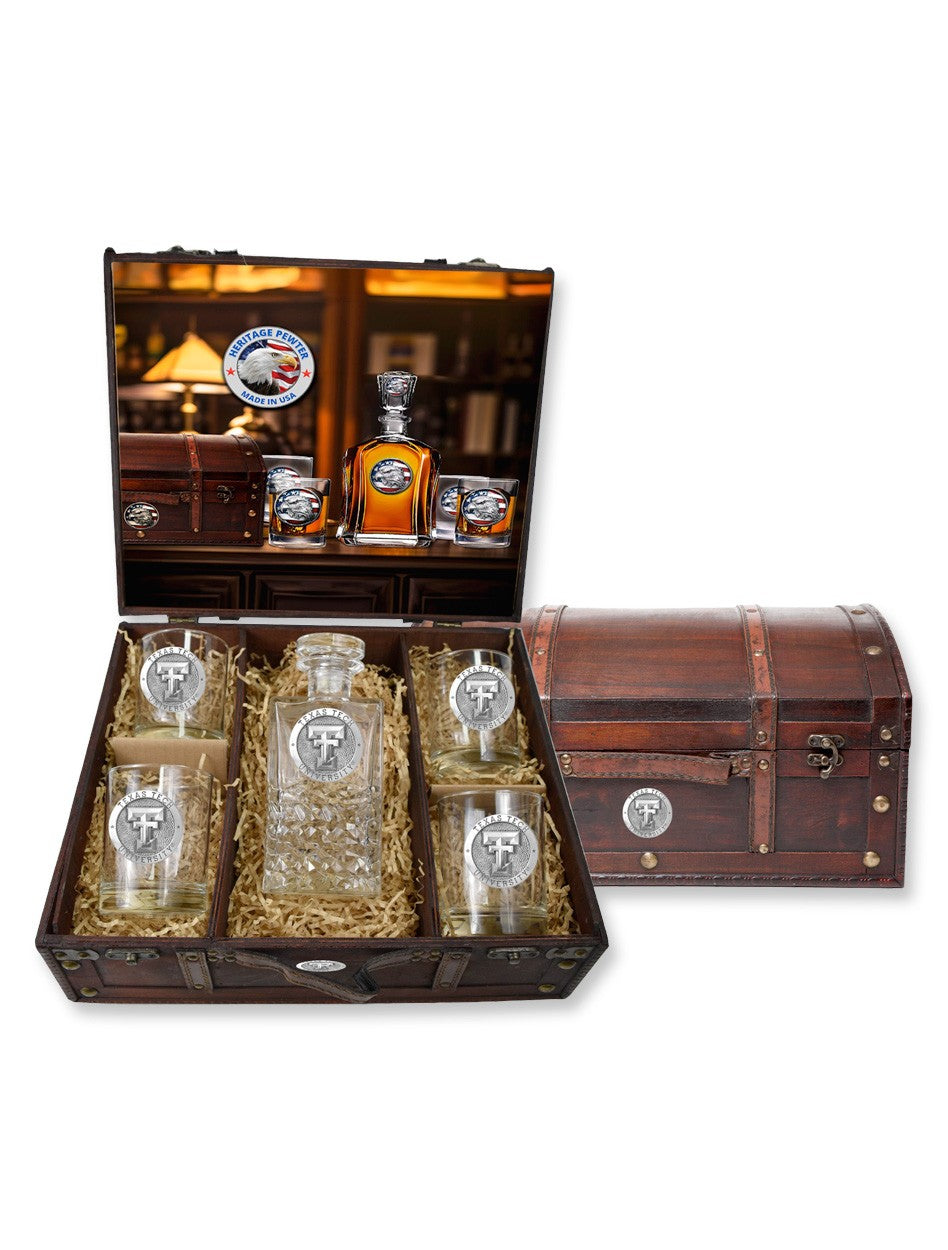Texas Tech Heritage Pewter Heritage Decanter with 4 Double Old Fashioned Glasses in Chest
