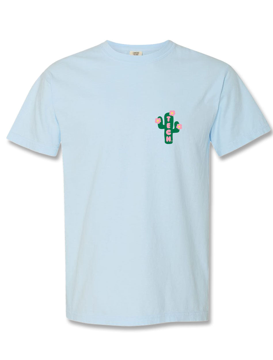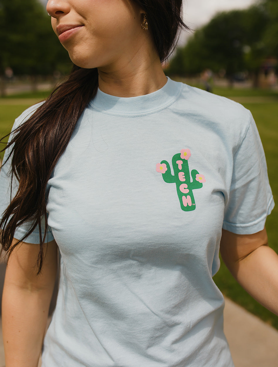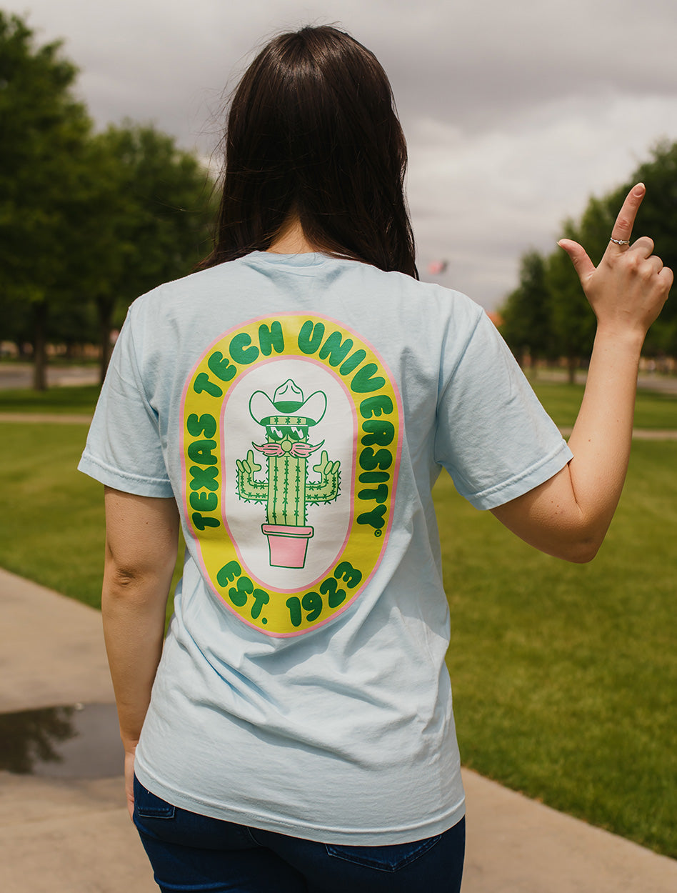 Add a pop of personality to your Red Raider wardrobe with the Texas Tech "Prickly Perfect" Short Sleeve T-Shirt. Featuring a retro-inspired cactus in a cowboy hat and boots, this playful design combines Texas charm with school spirit. The soft light blue tee is perfect for sunny days on campus, tailgates, or casual weekends. With bold “Texas Tech University Est. 1923” lettering in bright, eye-catching colors, this shirt brings fun and flair to your game day lineup. Yeehaw and Wreck ‘Em!