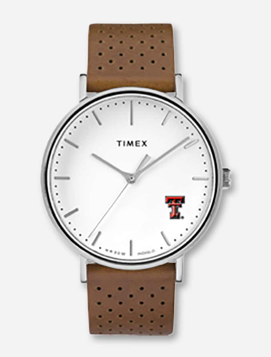 The minimalist design of Timex's Bright Whites collection puts the focus on our favorite team - pairing a clean white dial and perforated brown leather strap with the Texas Tech Double T logo.