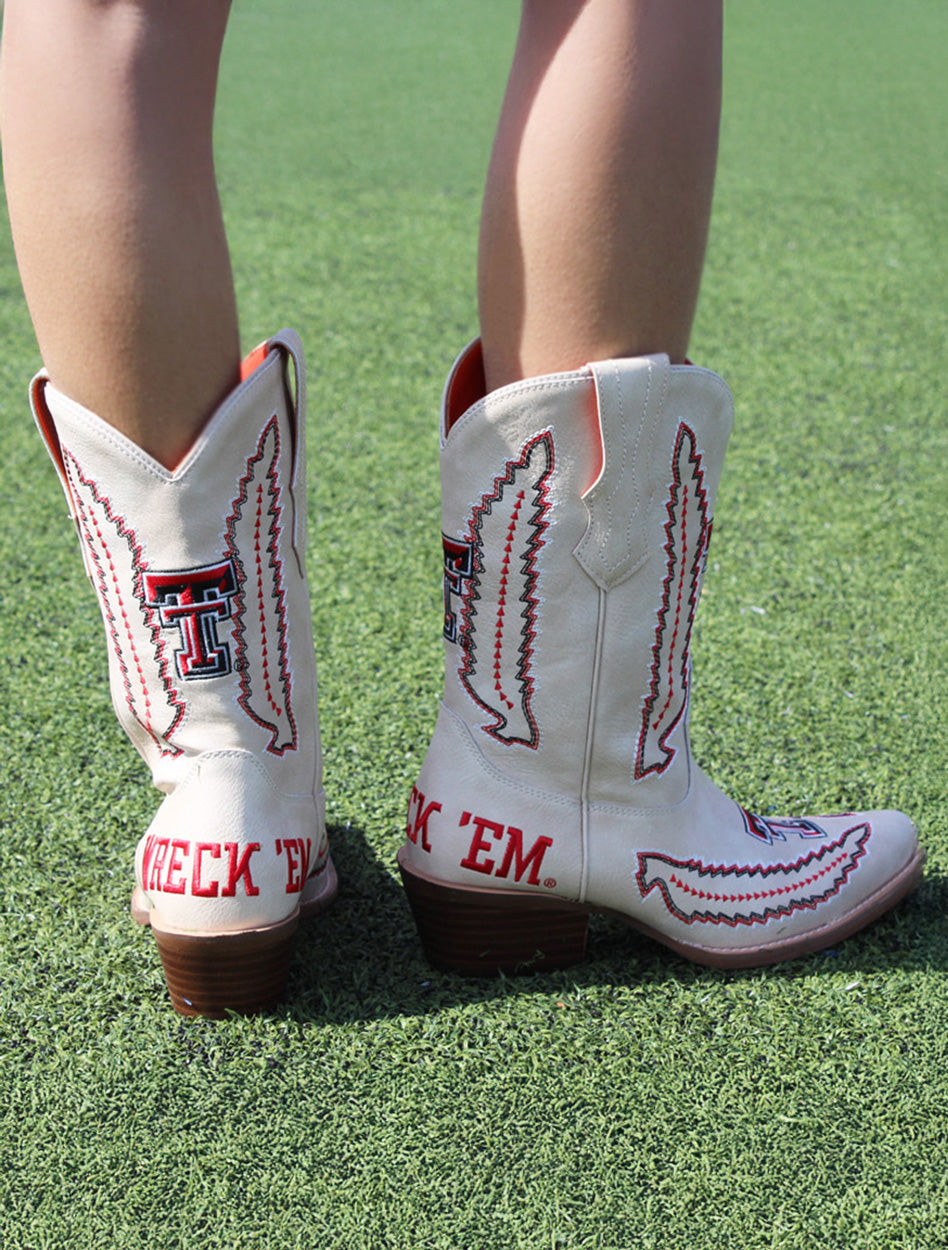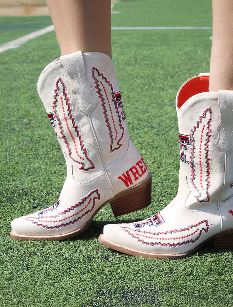 Bring fierce Red Raider flair to your Western style with the Vaccari Texas Tech "Mimi" Embroidered Women's Boots! These standout boots feature premium cream leather detailed with bold red and black embroidery, including the iconic Double T logo and the spirited "Wreck 'Em" slogan on the heels. Designed with a classic Western profile, comfortable stacked heel, and pointed toe, the “Mimi” boots blend tradition and trend for the ultimate gameday or everyday look. Whether you're at the stadium, a concert, or just showing off your Texas Tech pride, these boots deliver comfort, craftsmanship, and unmistakable school spirit.